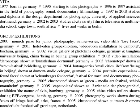 2000 munich prize for junior photography, winner-series, video stills 'love faces', germany // 2001 hotel-eden groupexhibition, video/room installation 'le campôtel', bochum, germany // 2002 visual gallery of photokina cologne, germany & tsinghua university beijing, china 'being in beijing' group exhibition // 2003 video installation 'chronotope' shown at 'künstlerhaus dortmund', germany // 2003 'chronotope' shown at 're/act-festival', heidelberg, germany // 2004 hutong-series 'small cities life' from 'being in beijing', shown at dumont-studio cologne, germany // 2004 portraits 'capetonians - found faces' shown at 'schömberger fotoherbst', festival for travel and documentary photography, germany // 2005 'chronotope' shown at 'green - media art festival, schloß mannheim', germany // 2005 'capetonians' shown at '3.triennale der photographie', exhibition 'the nature of skin', hamburg, germany // 2005 china video trailers shown during BFF-congress, hamburg, germany // 2005 photography works shown during 'voies off fringe festival', arles, france // 2005 'chronotope' shown at 'traces & omens noorderlicht fotofestival' groningen, netherlands
